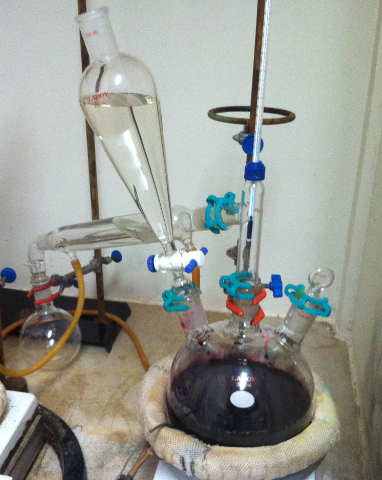 Set-up: 2L RB with simple distillation, add funnel, heating mantle and mag stir