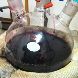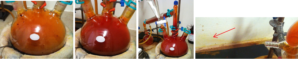 408.5g H2SO4 added dropwise from the add funnel, starting at 1 drop/s. Temp slowly climbs. At ~1hr, set mantle to 80 C, but after 15 minutes (mantle temp sensor said 88C), significant fumes puff out the take off vacuum connection with each drop of H2SO4, so turned mantle off again