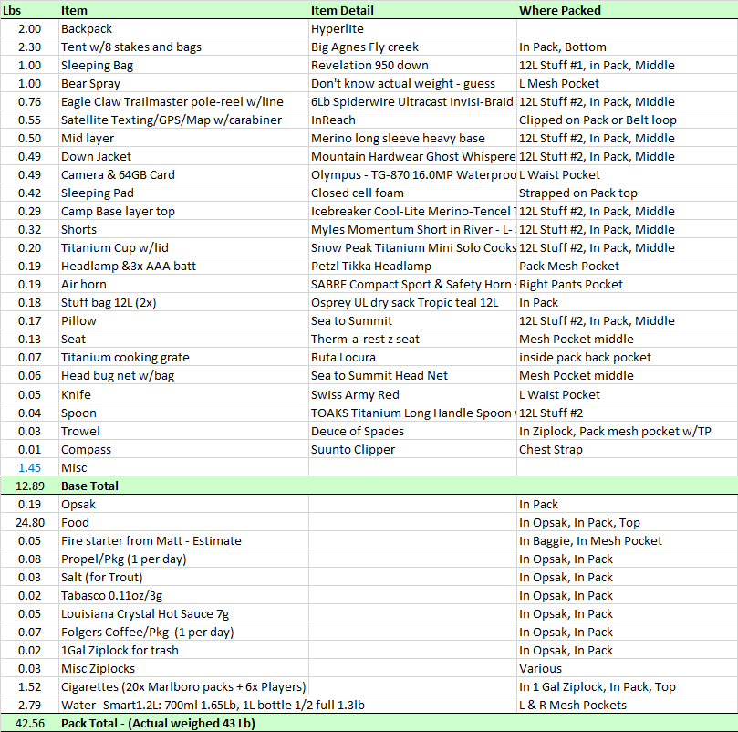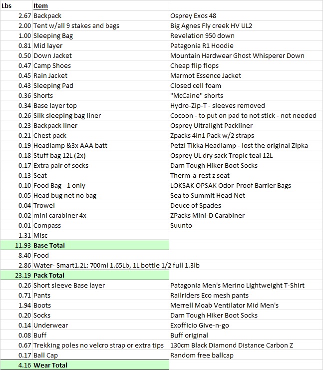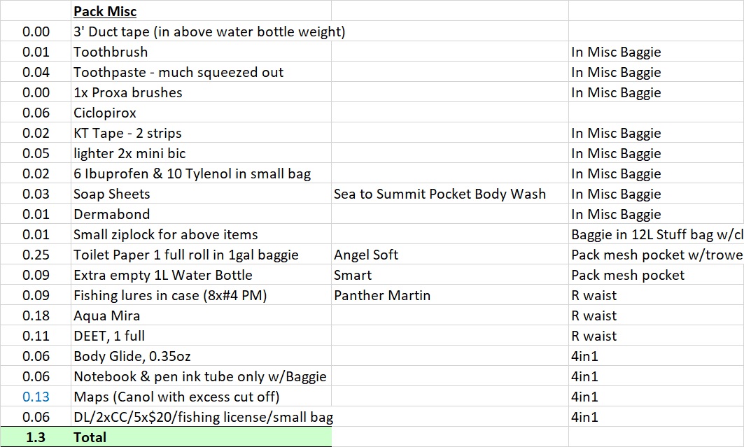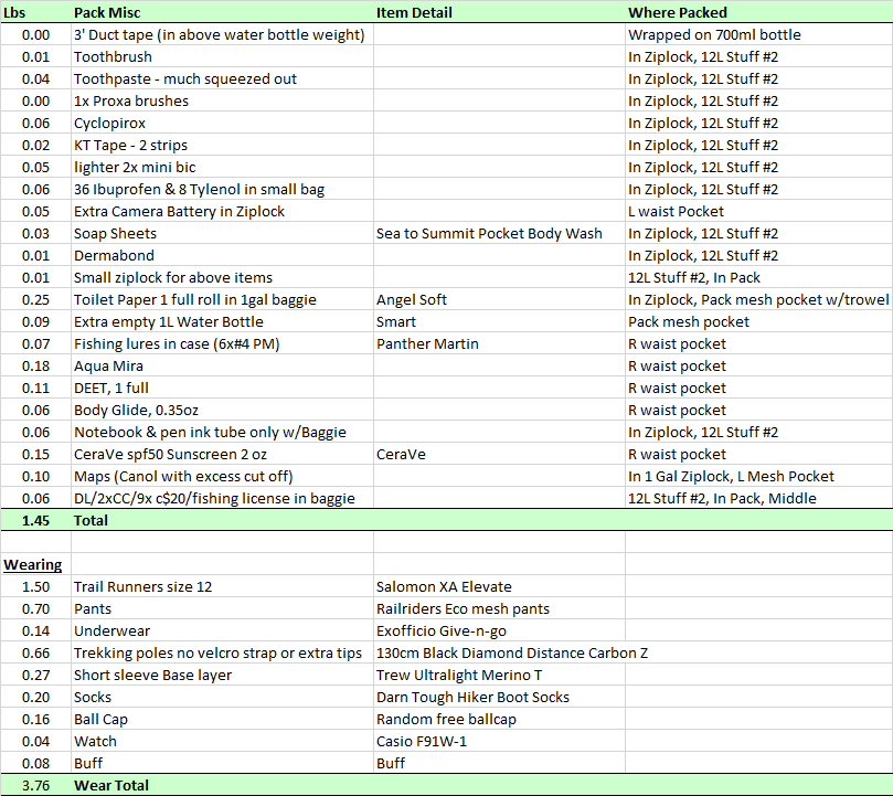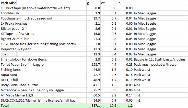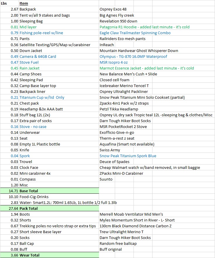 Equipment after Refit, with new lighter tent, no cook. 100 Mile Wilderness July 6, 2017